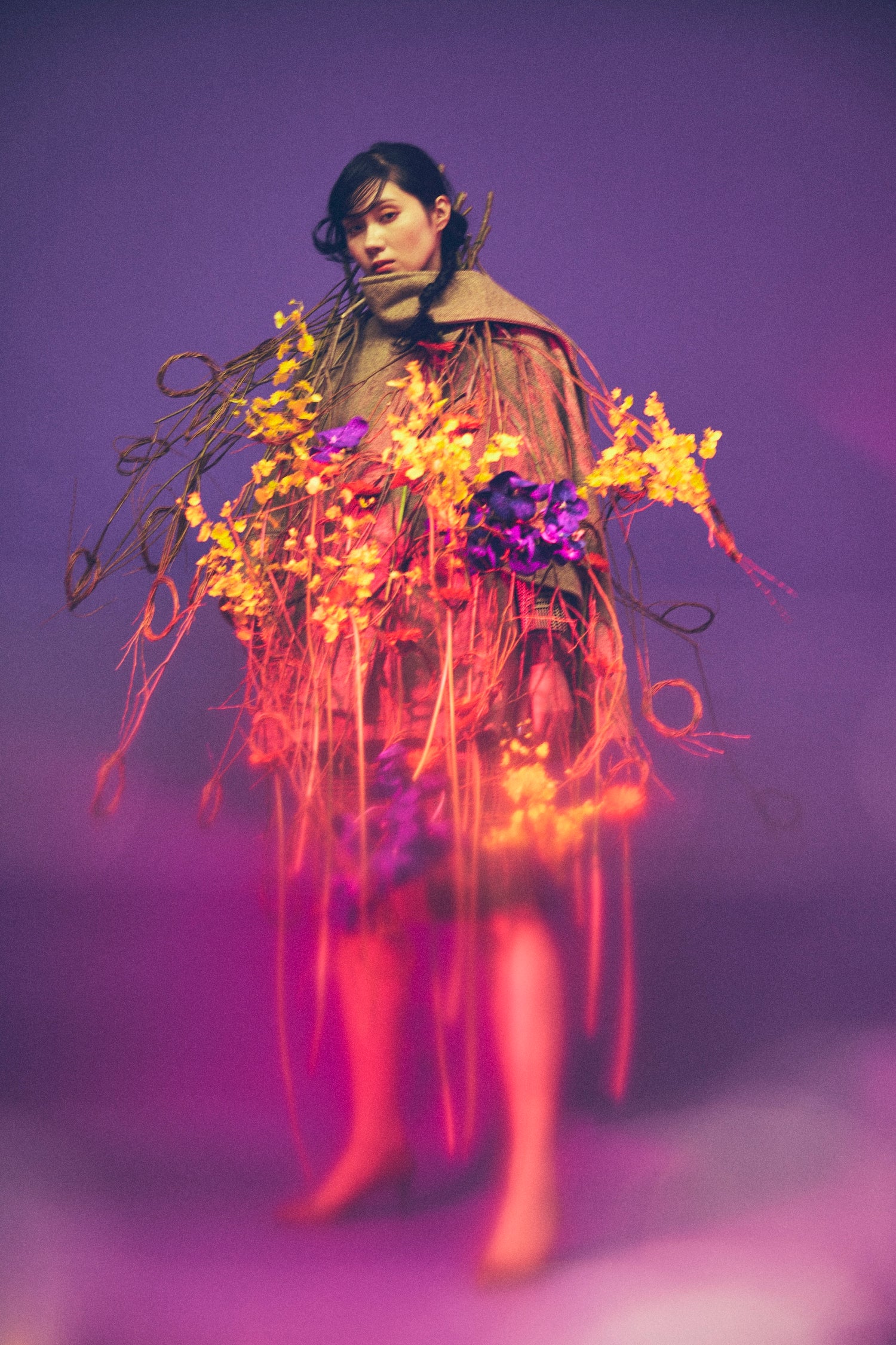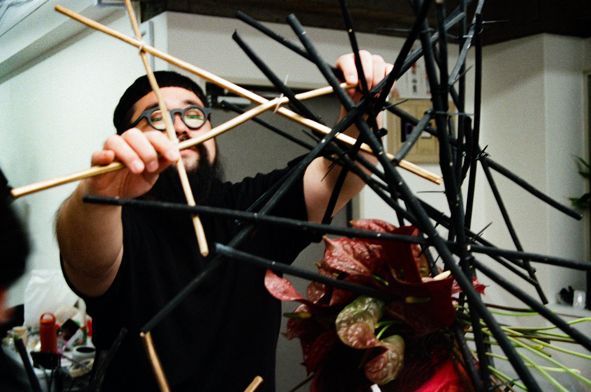 His process begins long before the first cut is made. Ozono spends hours walking through markets, forests, and city edges, letting the landscape dictate his palette. He listens—to the weight of a branch, the scent of a bud, the silence between storms. These encounters shape the mood of each arrangement, forming a dialogue between the natural world and the emotions he carries that day. The result is work that feels not constructed, but discovered.