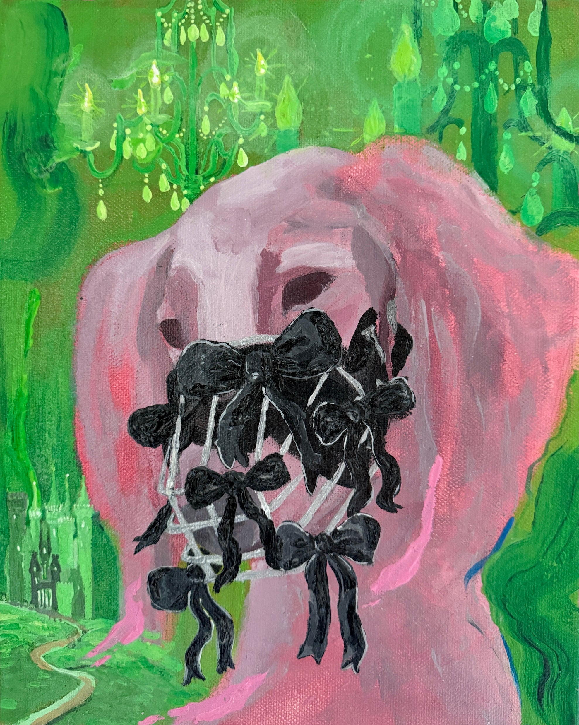 One of Kuriki’s recent series stages figures inside ambiguous interiors. Lit by spotlights and framed by warped or translucent backdrops, these figures hover between visibility and concealment. Drawn from archetypal sources—a fashion model, a mythic abduction, a noh performer, a queer dancer—they evoke personas we recognize, yet feel distanced from. Their outlines are sharply rendered, but the space around them dissolves. “I’m interested in that tension,” Kuriki says, “between what is clearly seen and what remains unsettled.”